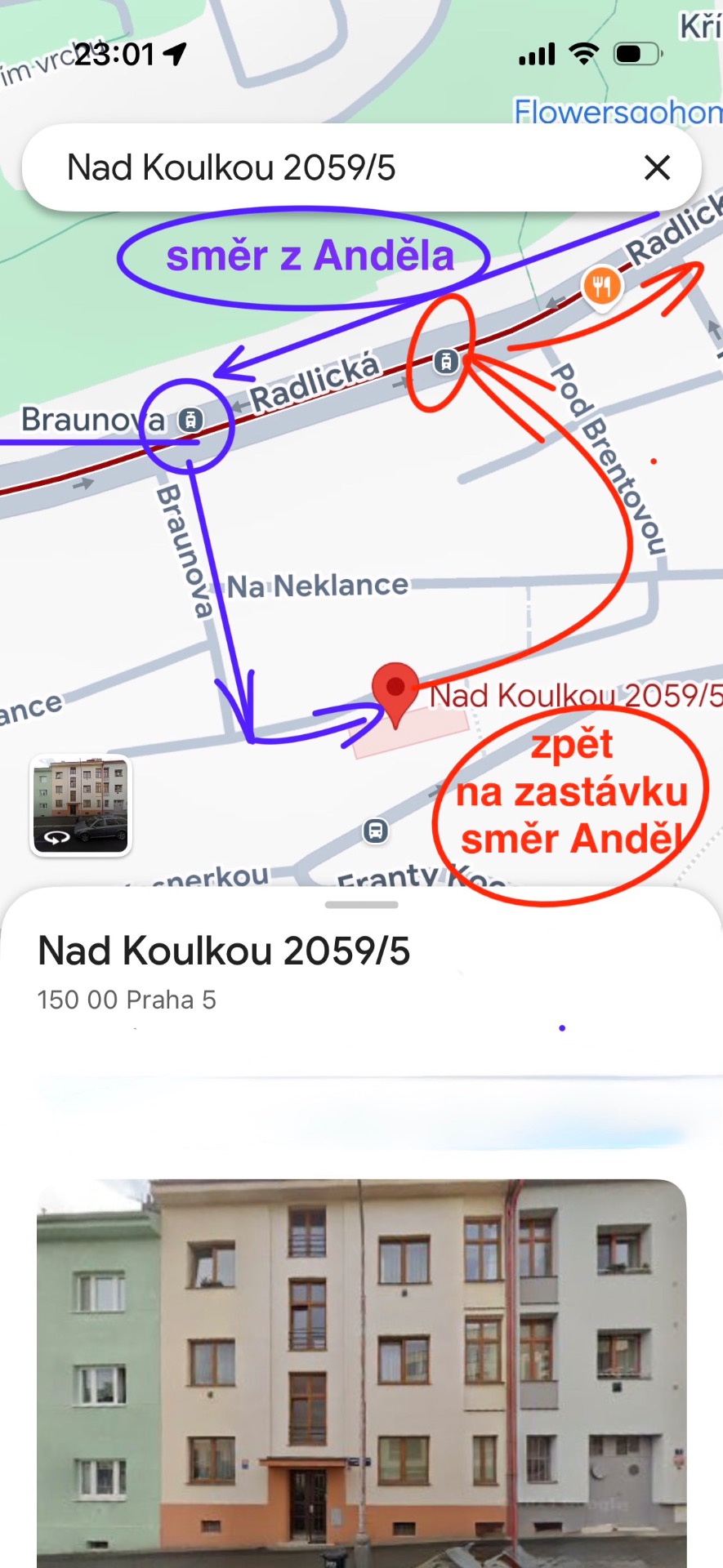Pro ty co rády chodí pěšky, ideální z metra Anděl , výstup na Knížecí, hned vpravo z metra, a vlevo kolem Lidlu a Ženských domovů, dál na semafor a vlevo, dále po Radlické ulici asi 10 min cesty a projít mezi domy do ulice Nad Koulkou.
